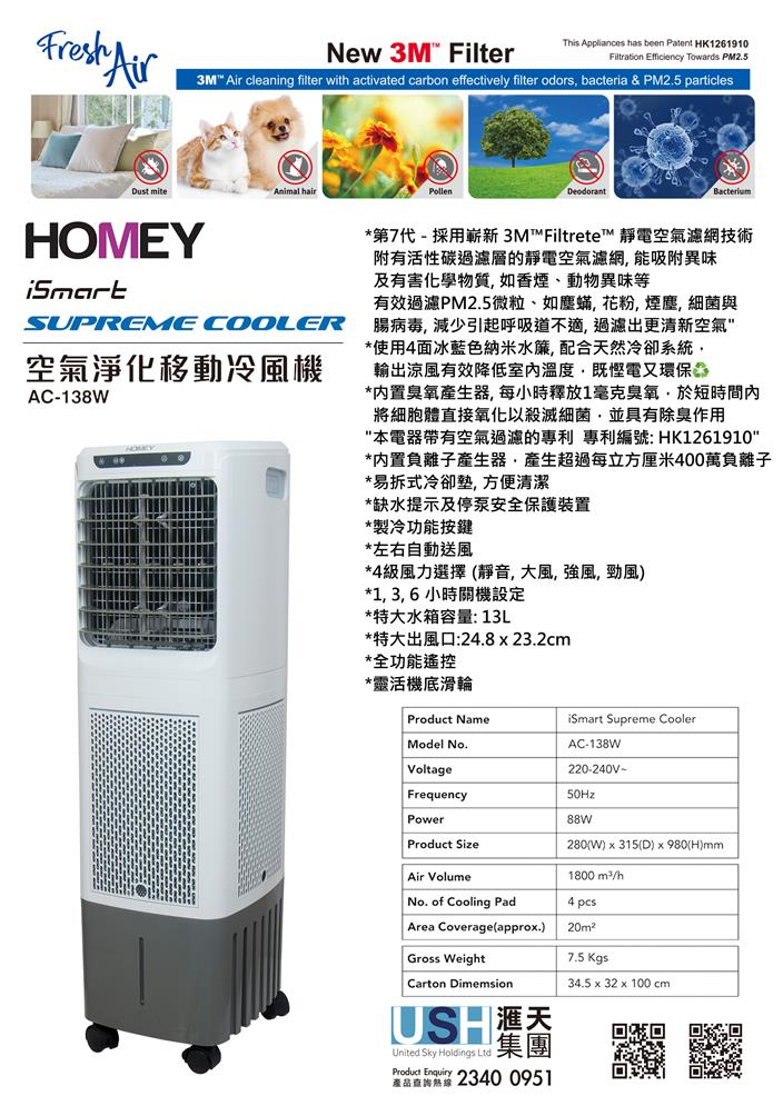 Homey 家美牌 AC-138W HOMEY 空氣淨化移動冷風機