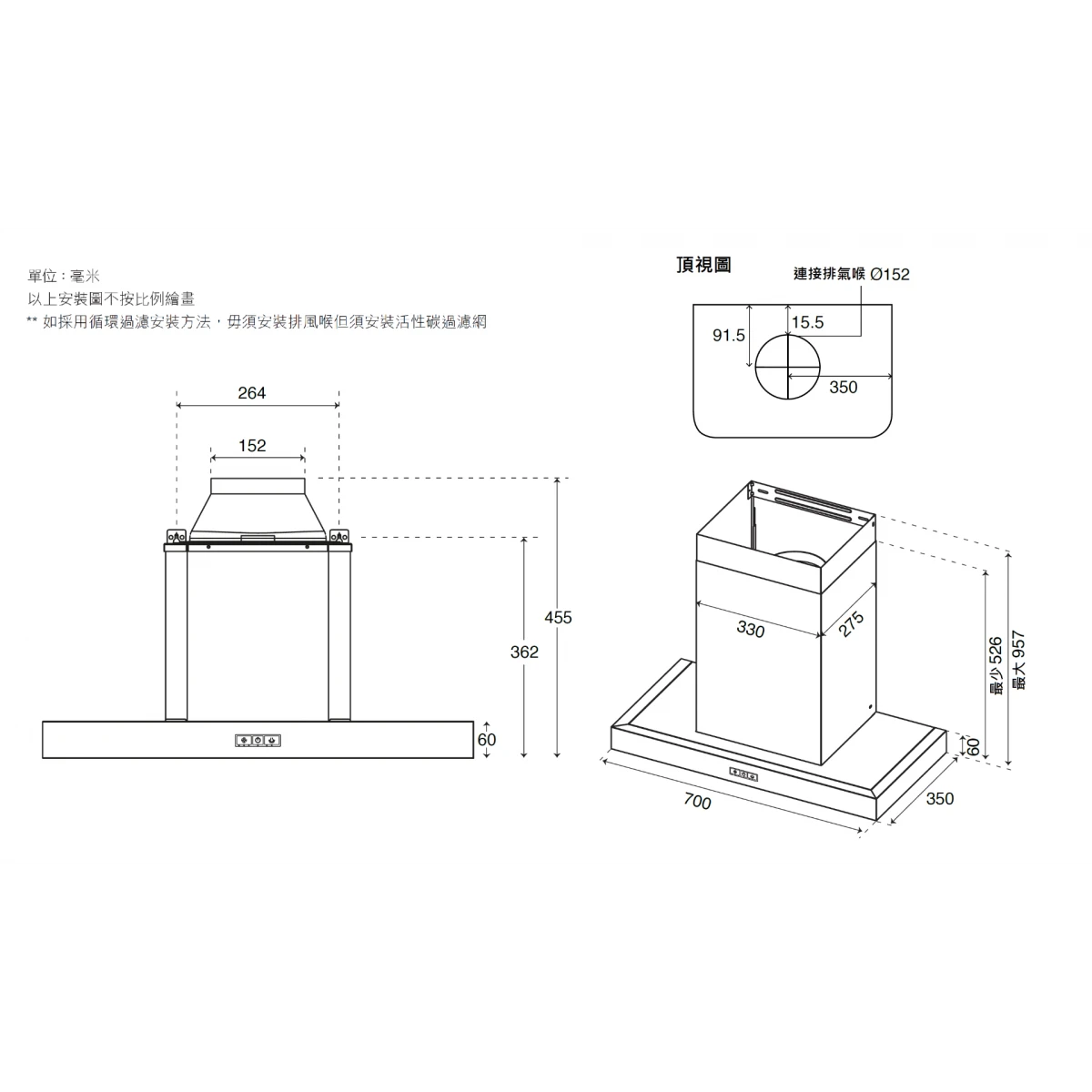 - 產品尺寸 (高x闊x深) / 毫米: 526-957 x 700 x 350
