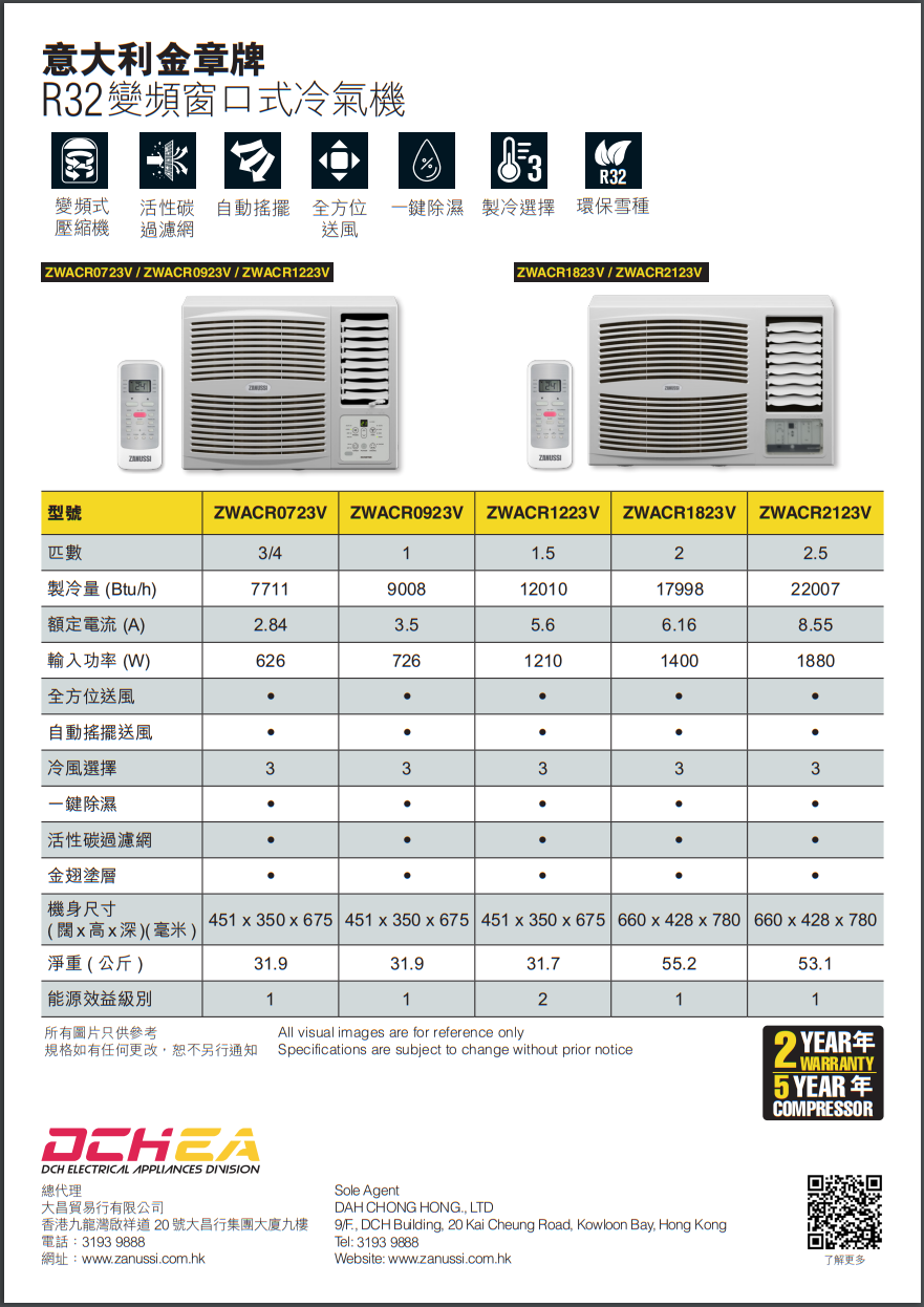 Zanussi 金章 ZWACR0723V 3/4匹 R32 變頻淨冷 窗口式冷氣機 (附無線遙控)